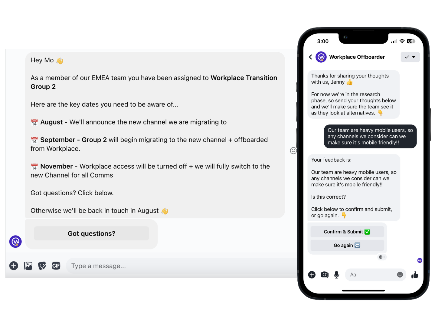 Ensure your Workplace Transition goes as smooth as possible with this automated bot. Keep staff aware of key timelines, collect new channel requirements and send important updates as your transition dates approach.